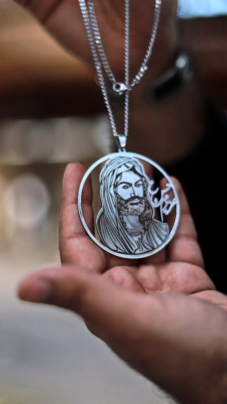 گردنبند حکاکی شمایل امام حسن جان علیه السلام طرح عزیزم حسن علیه السلام استیل رنگ ثابت ضد حساسیت به همراه زنجیر ۶۰ سانتی استیل ابعاد پلاک قطر ۶ سانتی متر